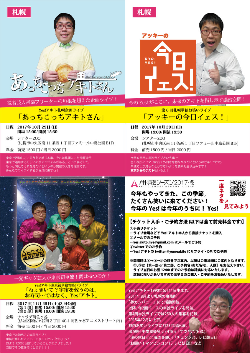 ライブ会場などでYes!アキト本人から直接購入 ②メールでのご予約 yes.akito.libe@gmail.com ③twitterでのご予約 Yes!アキトのtwitter@yumeakitoにリプライ・DMでご予約 開場時は①→②→③の順番でご案内。 ②、③でのご予約の場合「第一部か第二部、ご予約名(あだ名可)、人数」をお伝えください。ライブ当日のお昼12時までのご予約は確実に対応できます。 |