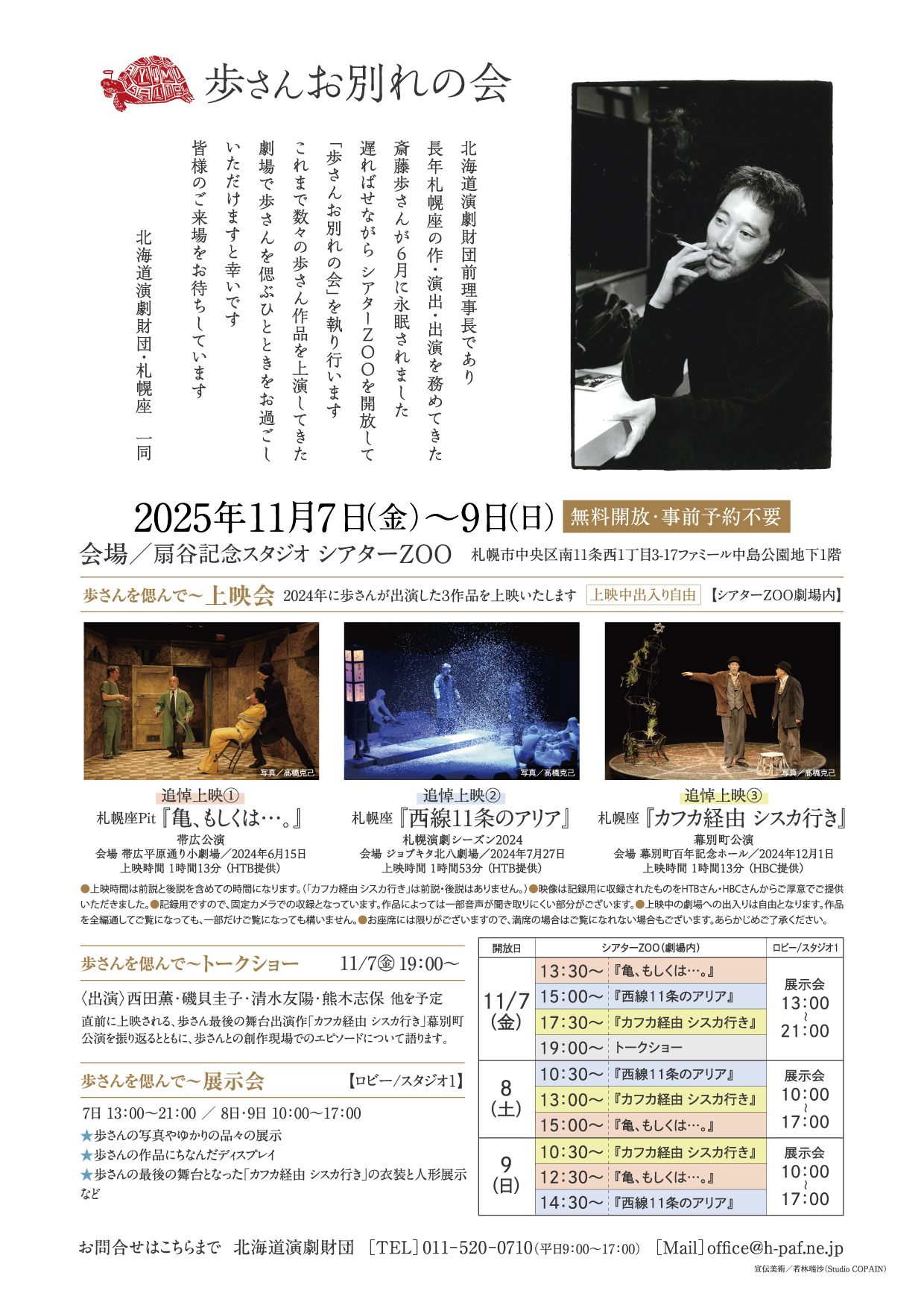 劇場内では「追悼上映」ということで、HTBさん・HBCさんに記録映像のご提供をいただき、2024年に歩さんが出演した3作品「亀、もしくは・・・」「西線11条のアリア」「カフカ経由 シスカ行き」を上映いたします。