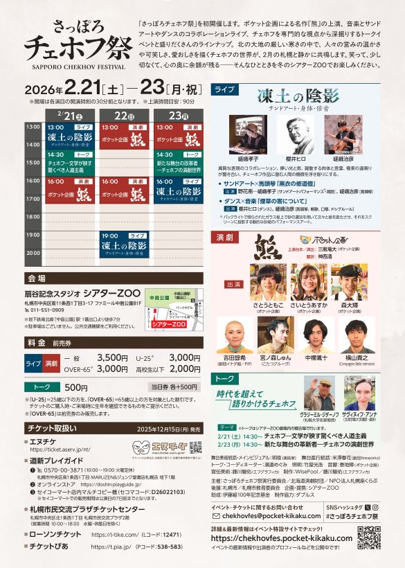 「さっぽろチェホフ祭」を初開催します。ポケット企画による名作『熊』の上演、音楽とサンドアートやダンスのコラボレーションライブ、チェホフを専門的な視点から深掘りするトークイベントと盛りだくさんのラインナップ。北の大地の厳しい寒さの中で、人々の営みの温かさや可笑しさ、愛おしさを描くチェホフの世界が、2月の札幌と静かに共鳴します。笑って、少し切なくて、心の奥に余韻が残る――そんなひとときを冬のシアターZOOでお楽しみください。