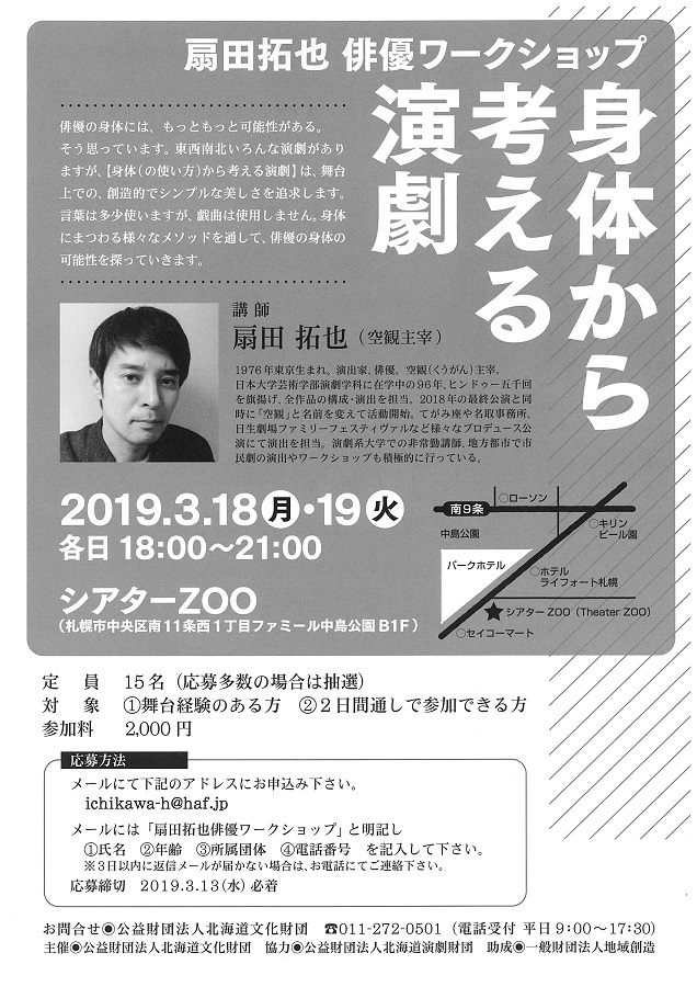 メールにて下記のアドレスのお申し込みください。 <ichikawa-h@haf.jp> メールには「扇田拓也俳優ワークショップ」と明記し ①氏名 ②年齢 ③所属団体 ④電話番号 を記入して下さい。 3日以内に返信メールが届かない場合は、お電話にてご連絡ください。 応募締め切りは 2019年3月13日(水)必着 |